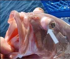 Barotrauma is a condition caused from the expansion of gas in a fish’s swim bladder during capture due to changes in pressure as a fish is reeled up from deep water to the surface. Some signs of barotrauma include bloated belly, bulging eyes and the stomach protruding from the mouth. Many fish suffering from barotrauma become what fishermen call floaters, fish that can’t submerge because they can’t overcome the added buoyancy of their expanded swim bladder. (Read More)